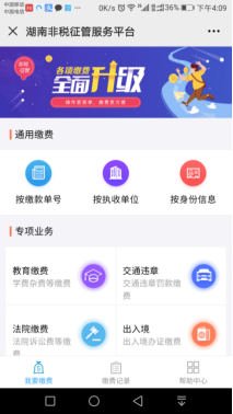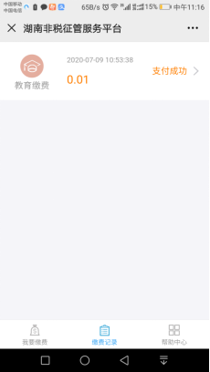 ⑥ 缴费成功后,用户可返回“湖南非税征管服务平台” 首页,点击底部的缴费记录,即可以查看通过平台缴费的所有记录,点击某一条记录,即可查看记录的详细信息。