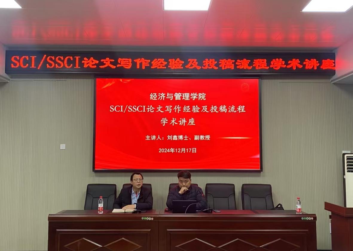 2024年12月17日晚,衡阳师范学院太阳网集团tcy8722成功举办主题为“SCI/SSCI论文写作经验及投稿流程”的学术讲座。讲座由太阳网集团tcy8722副院长邹建国主持、太阳网集团tcy8722副教授刘鑫为主讲嘉宾。经济管理学院部分专家老师以及全体研究生参与此次学术讲座。