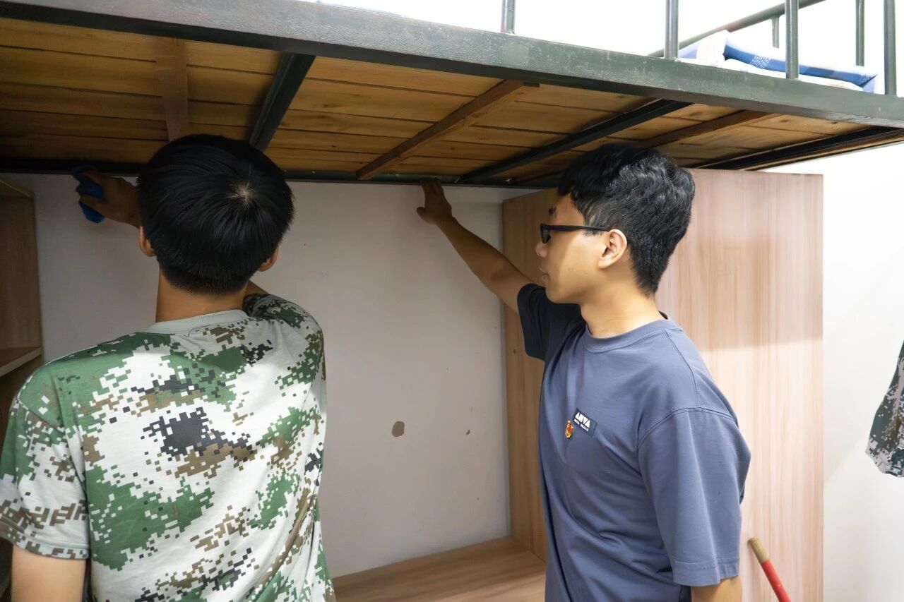 为助力学院在军训内务评比中争创佳绩,党员同志们主动亮明身份,以饱满热情投身新生宿舍卫生服务工作。他们细致擦拭书桌与衣柜,彻底清扫地面,逐一排查并清理卫生死角;同时贴心协助新生整理行李,手把手传授实用收纳技巧。党员们的耐心帮助与细致服务,逐渐消除了新生初入宿舍的陌生与不安。