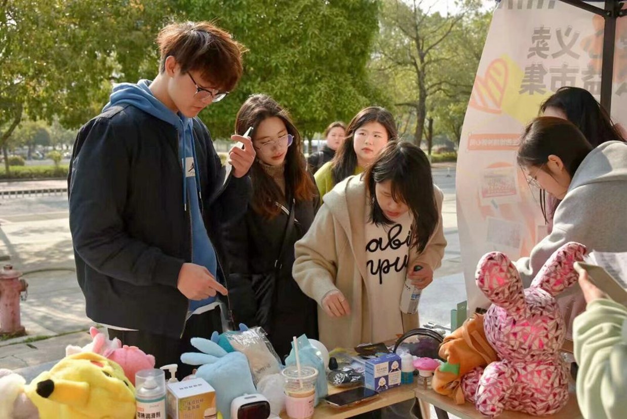 义卖活动现场布置匠心独运,义卖品丰富多样。从手工艺品、毛绒玩偶到充满温度的绘画书籍,每一件都承载着独特的创意。现场播放的音乐与春日暖风交织,吸引往来的同学驻足留连,寻找心仪的物品。学院曹心雨同学表示:“这样的活动真的很有意义,既能够买到喜欢的物品,又能为公益事业献上一份爱心。”