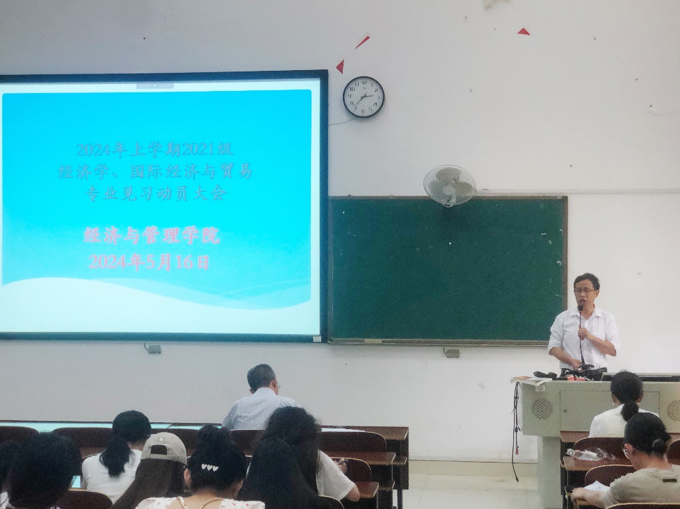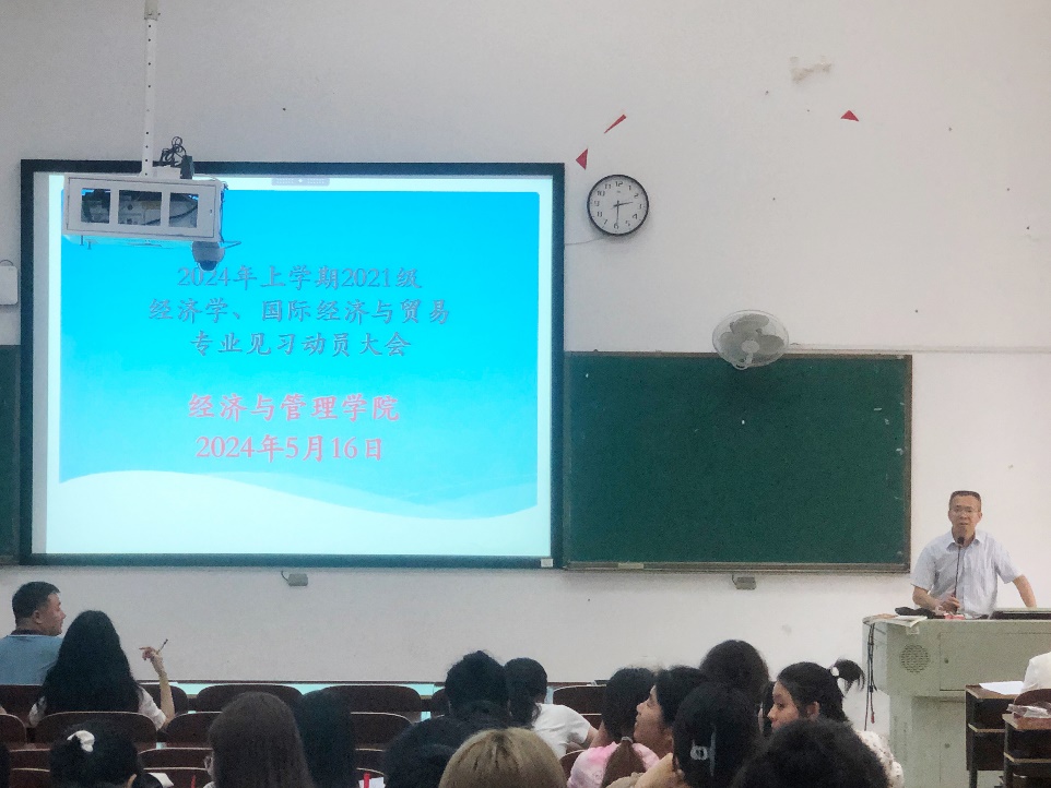 2024年5月16日下午14:30,我院于外语楼北301召开2021级经济学及国际经济与贸易专业见习动员会。院长肖黎教授、副院长陈忠文副教授、办公室主任兼教学秘书陈敏及全体指导老师参加了会议。会议由国际经济与贸易专业负责人张利军博士主持。
