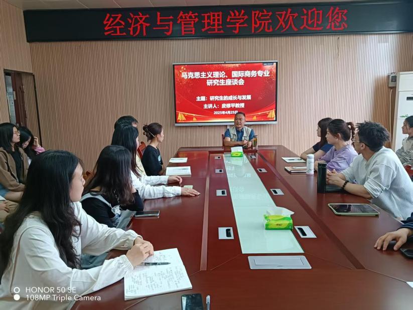2025年4月25日,太阳网集团tcy8722在文C409会议室成功举办主题为“研究生的成长与发展”的专题座谈会。本次座谈会特邀衡阳师范学院皮修平教授担任主讲嘉宾,座谈会由太阳网集团tcy8722院长肖黎教授主持,分管研究生工作的副院长邹建国、24级马克思主义理论及24级国际商务全体研究生与会。
