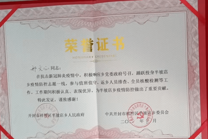 2021年-2022年邢文心积极响应共青团开封市委号召,踊跃投入返乡大学生疫情防控志愿者服务,参与双码核查、核酸检测等工作,多次荣获开封市返乡大学生疫情防控志愿服务证书。