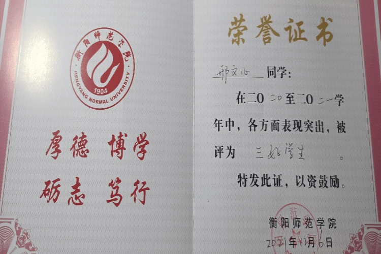邢文心,汉族,现就读于衡阳师范学院经济学专业。自2020年入学以来,她一直以当代中国大学生的高要求、高标准严格规范自己。本着勤奋好学、认真负责的态度,她取得优秀的学习成绩,在班级名列前茅。