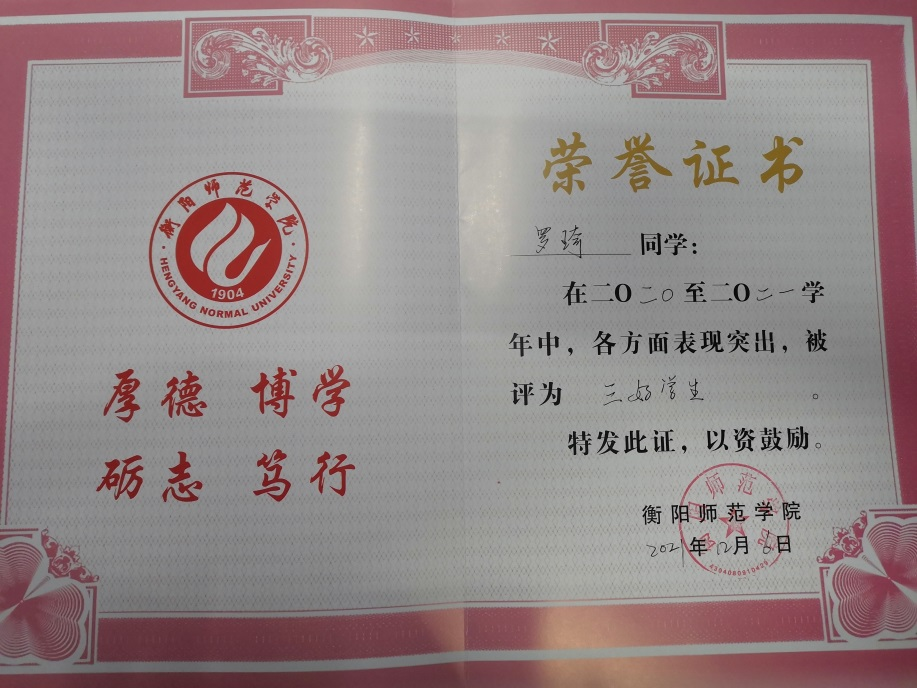 她注重思想的提升,时常去阅读室去充实自己。在学习方面,她始终把学习作为自己的第一要务,刻苦努力,积极进取。她不仅仅满足于通过考试,她所追求是优秀。这种信念让她在班上名列前茅,连续两学年成绩与综合素质排名第一,通过不懈努力曾荣获2019-2020年度“优秀共青团员”荣誉称号和2020-2021年度“三好学生”荣誉称号、2019-2021连续两年获得校三等奖学金、国家励志奖学金等,并考取高中数学教师资格证、初级会计从业资格证、国家计算机二级证书、英语四级证书、英语六级证书、普通话二乙证书等专业证书。