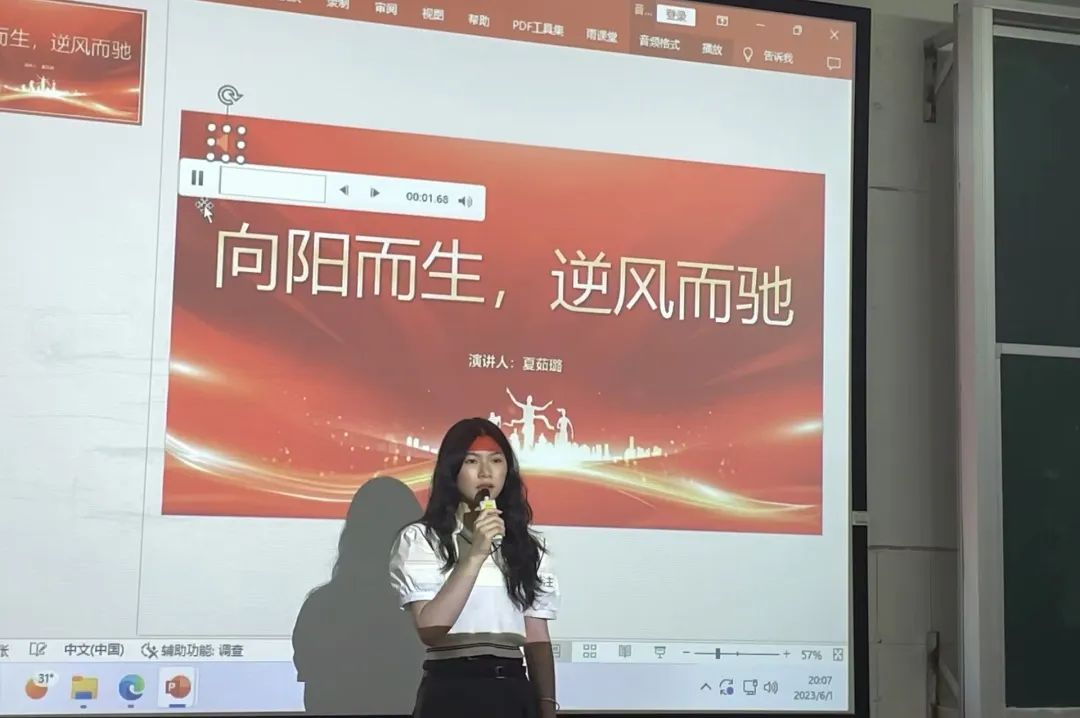 “我脑海中清晰的记得,那天微风不燥,阳光正好,仿佛太阳将所有人间的珍藏品都倾泻我一人。是的,我正青春,我正少年,我没有什么可失去的。顶着一张年轻的脸庞守着一盏孤灯,带着不知疲倦的身躯在题海里遨游。于是我见过最迷人的朝阳,赏过最绚烂的晚霞,听过最孤独的乐章。就这样我带着这股执着、不服输的劲,跨过重重的山脉,站在今天的讲台上。”